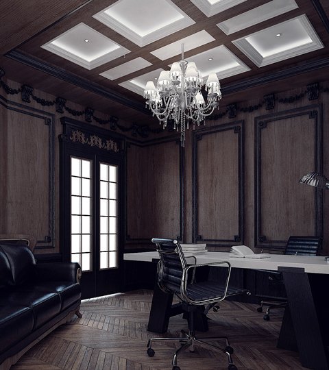 Интерьер кабинета выполнен в классическом стиле. Небольшая площадь помещения позволяет создать уютное, камерное, личное пространство для работы и уединения от будничной суеты. Паркет на полу, деревянный декор на стене, кессоны на потолке выполнены в двух цветах дерева. Стены могут быть выполнены в шпонированных панеля, обоях или декоративной штукатурке. В интерьере могут быть добавлены разные цветовые акценты-в аксессуарах, текстиле (подушках), в картинах на стене...